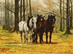 1990Drie paarden rusten in het bos tijdens de arbeid.